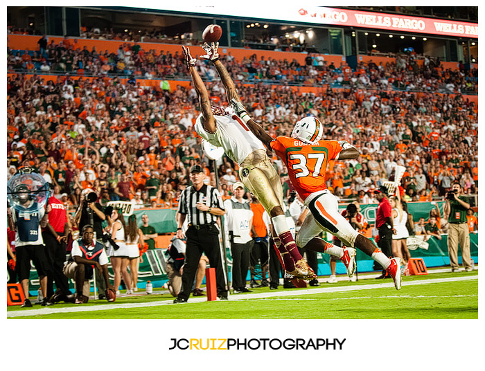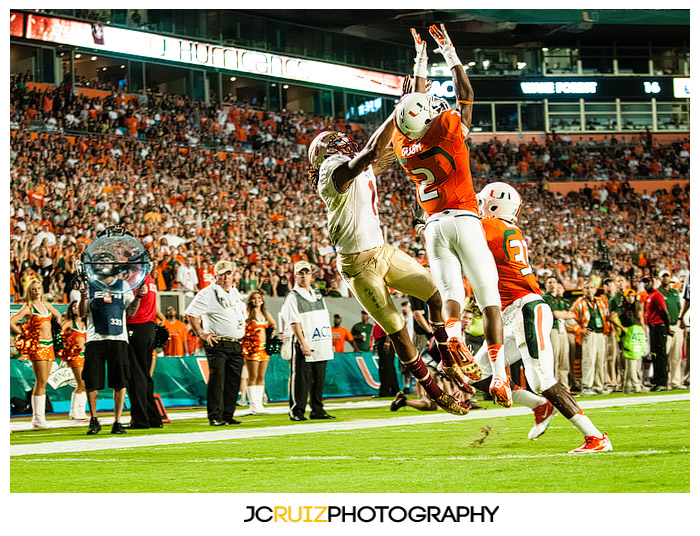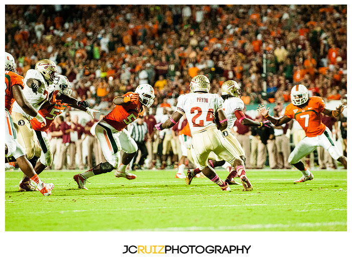 I had a great time at the UM vs. FSU game. I got some great shots and I missed some as well. There was a good amount of noise in my photos but I was able to clean the majority of it up using Nik Software’s DFine software. I have one more night game left but I already know it won’t be as exciting as an UM vs. FSU game.