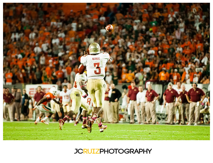 I walked onto the field for the UM team running out of the tunnel and found myself surrounded by throngs of other photographers, more than usual. The reason of course was UM vs. FSU. After the introductions I found myself a spot in the endzone to setup shop and that was where I was most of the game. I would look up and down the field and see nothing but photographers everywhere.